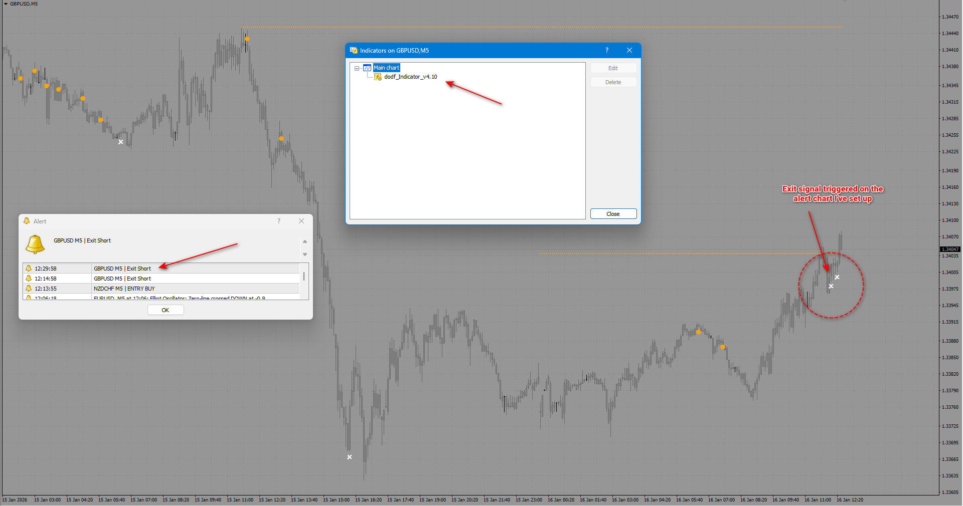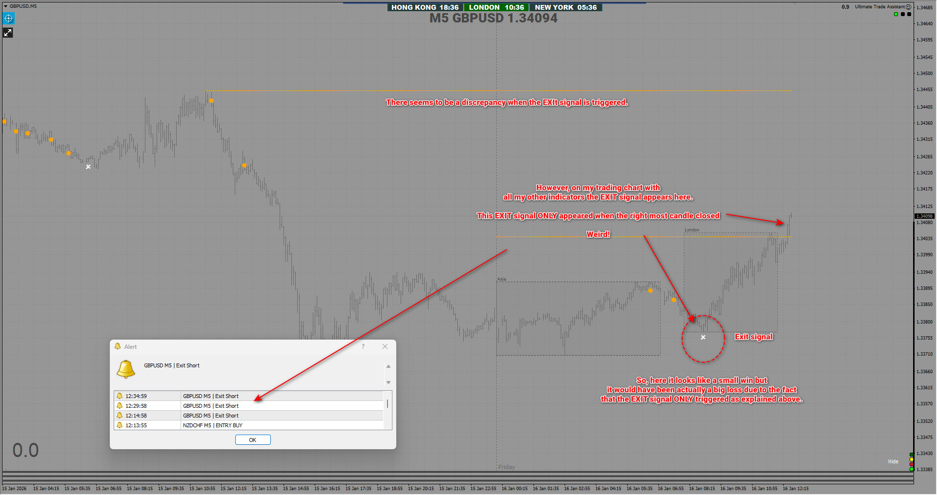 Unfortunately, a weird situation occurred today when I had the indicator set up on both my trading chart and a separate alert chart. As you can see in the attached screenshots, the EXIT signal appears in different places for the same pair. I know that it is GBPUSD, and you have not mentioned that it works on that pair or any other pairs other than those you listed. Nevertheless, I am testing it on all pairs and assets to see how it reacts.