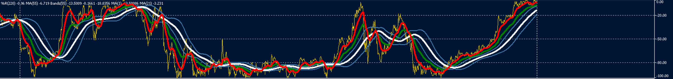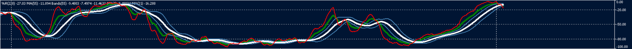 This version of Williams Percent Range has an addition of Bollinger bands to help identify possible overbought and oversold levels breaks.
