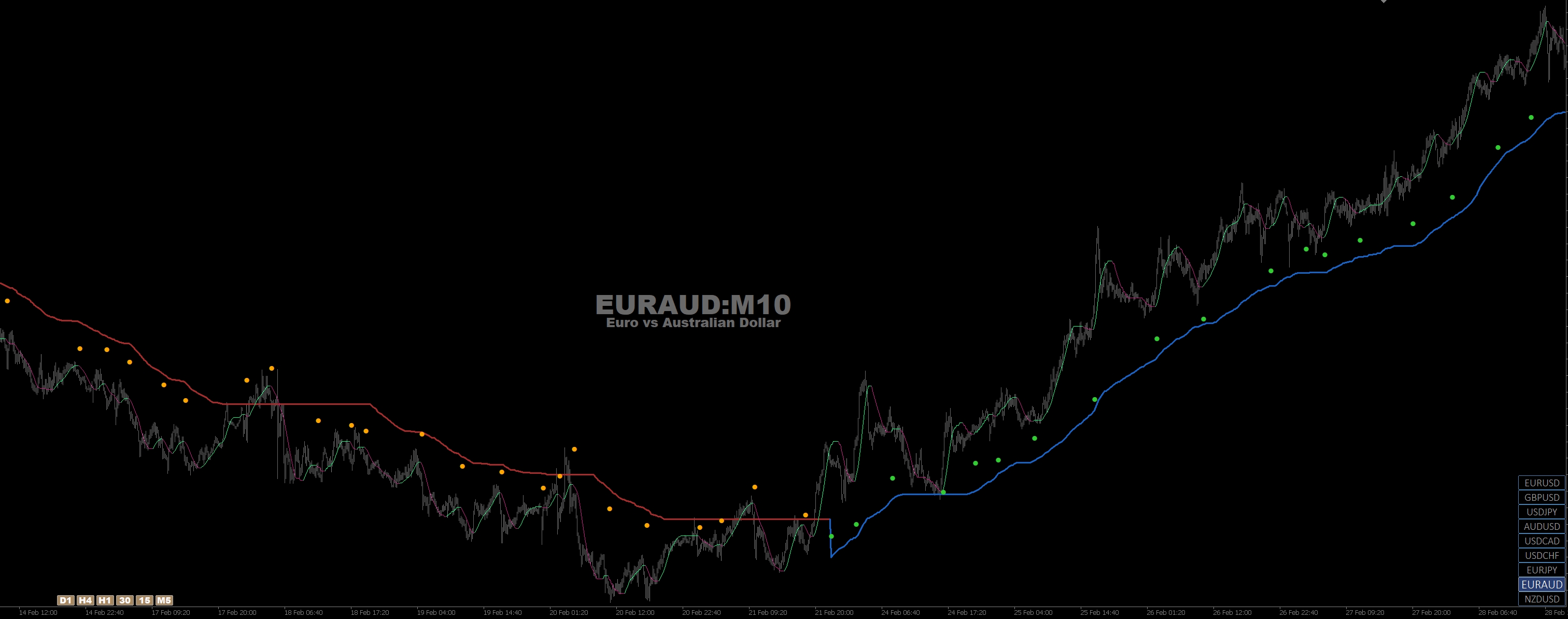 It dynamically adjusts the trend-tracking sensitivity based on Current Market volatility, effectively widening the gap during spikes and tightening it during stable moves.