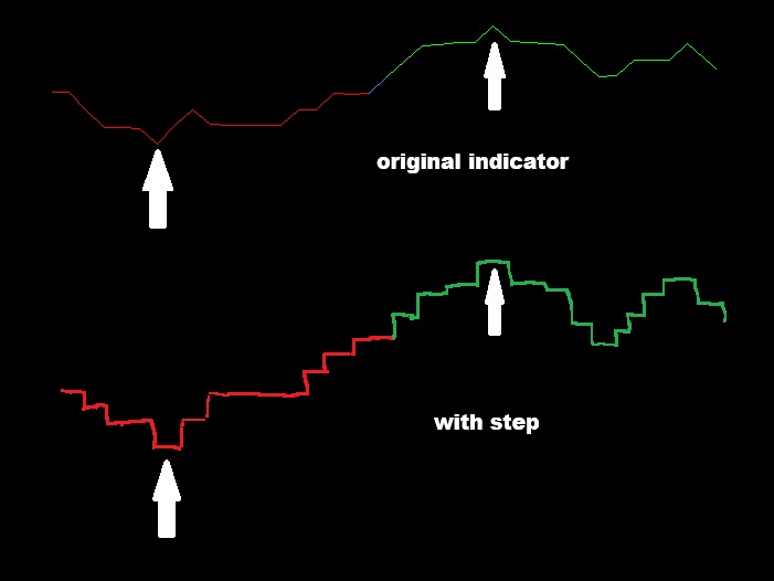 21906hello all been away awhile i am hoping somebody's can help with these 2 things ? first I've been searching for a 2 moving average cross that changes both colors on cross (see picture). and second could someone look to see if its possible to make this mfi have steps ? it changes color on 50 level cross i will post original and a version using arrows and in the picture is also how im trying to make it look ?