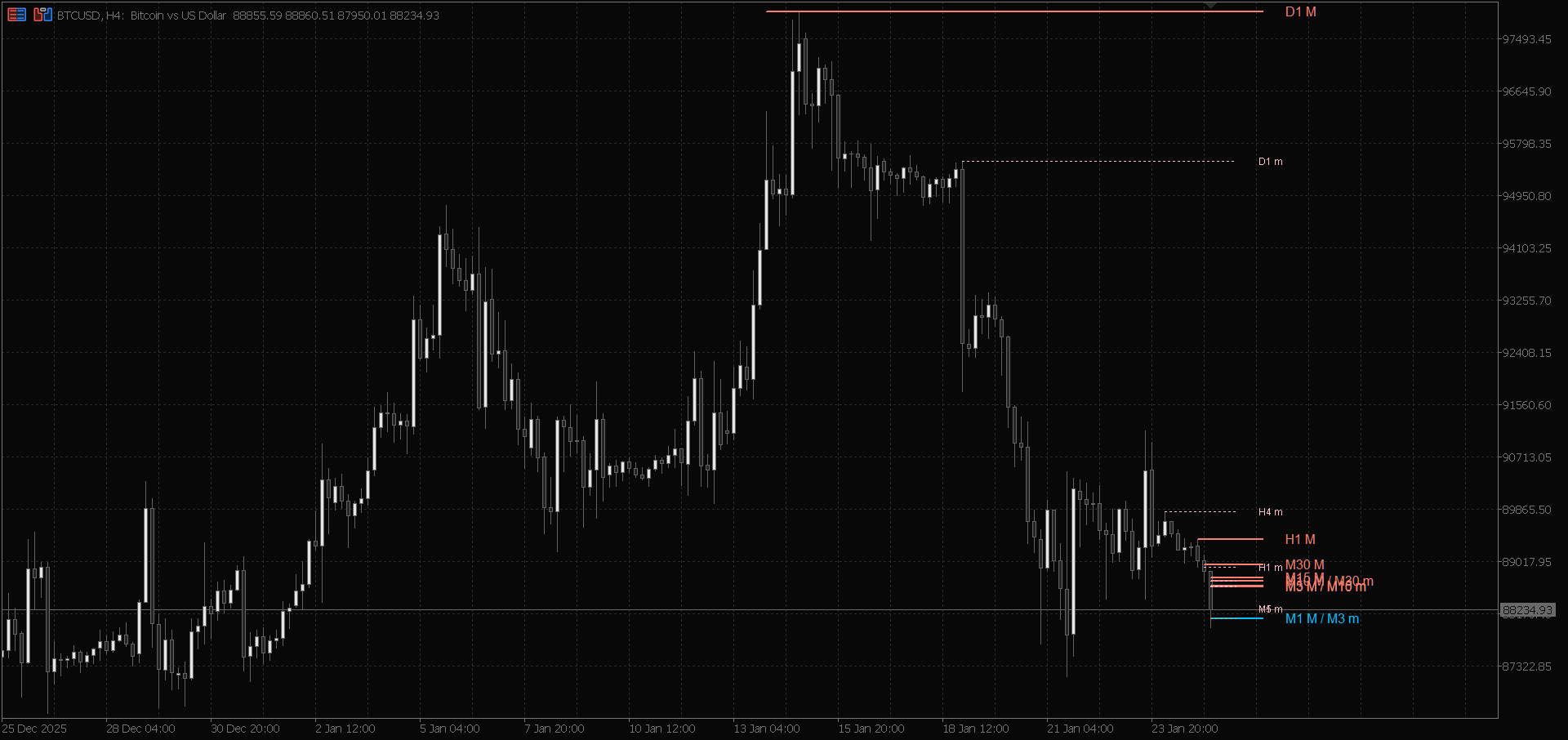 This indicator is best used to determine the Bias (Direction). If the H4 and H1 lines are Bearish (Red/Pink above), focus only on selling opportunities on lower timeframes.