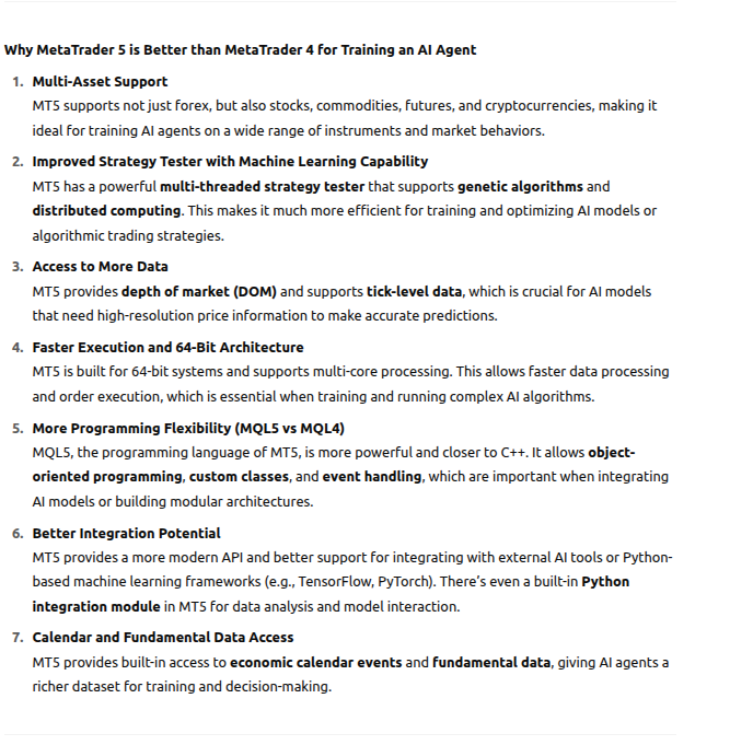 Metatrader 4 does not support Python Panda directly, you either need to use .DLL or .CSV socket which makes it unstable, particulary .CSV file. Third party plugins like ZeroMQ is not official and can vanished any day. You have direct and official Python API with MT5. Its possible to write tradeorders directly from Python to oMT5.ionone wrote: Sat May 17, 2025 12:22 am MT5 is the same it's even more complicated. so i don't think that's an option