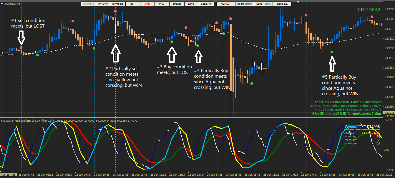 2, wait for white and yellow indicators to cross up main indicator (still red) wait for main indicator to turn green, this is a buy condition
