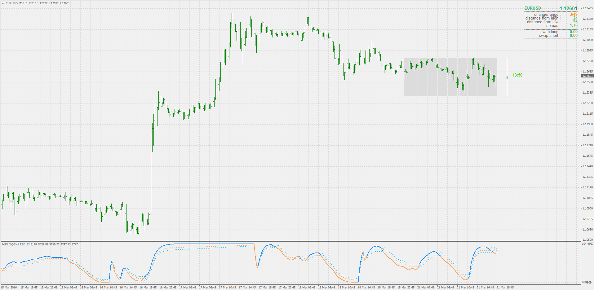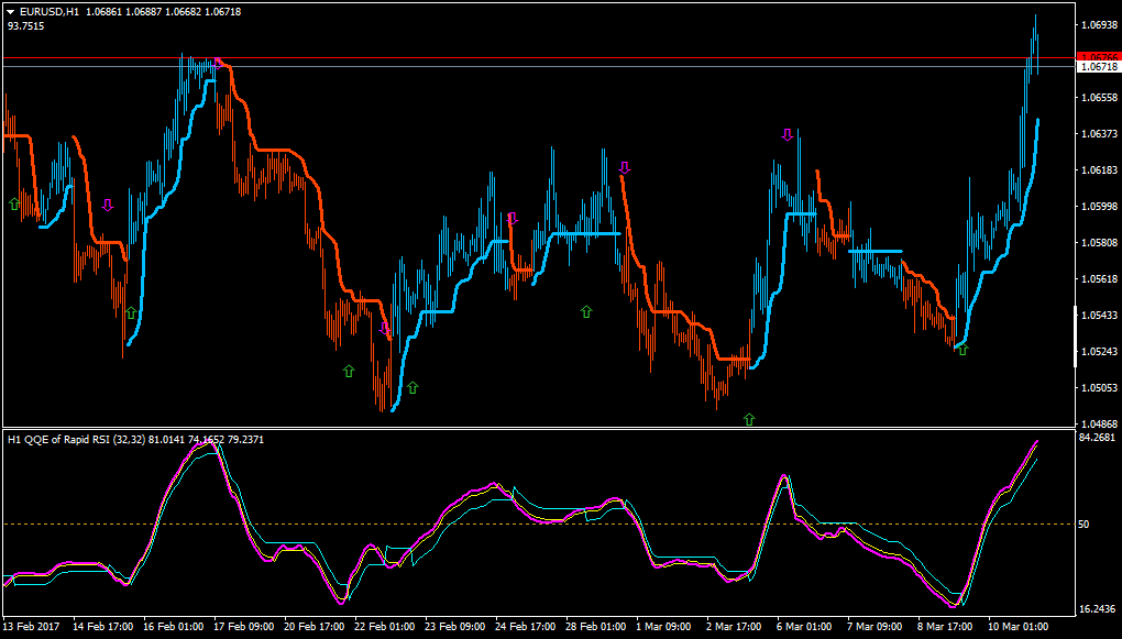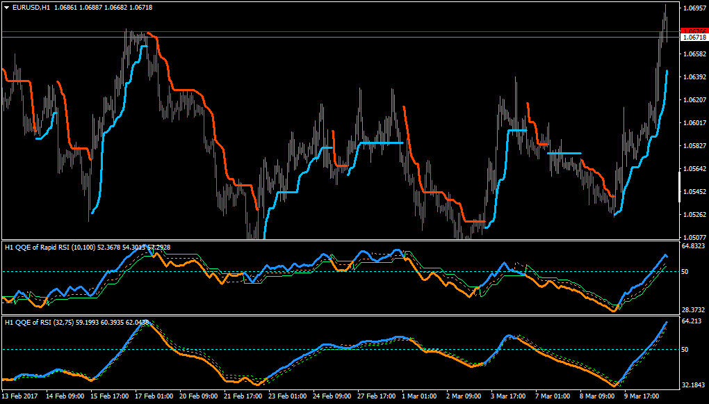 Trades can be generated when any of the QQE outputs (RSI, Fast ATR TL or Slow ATR TL) crosses these levels.