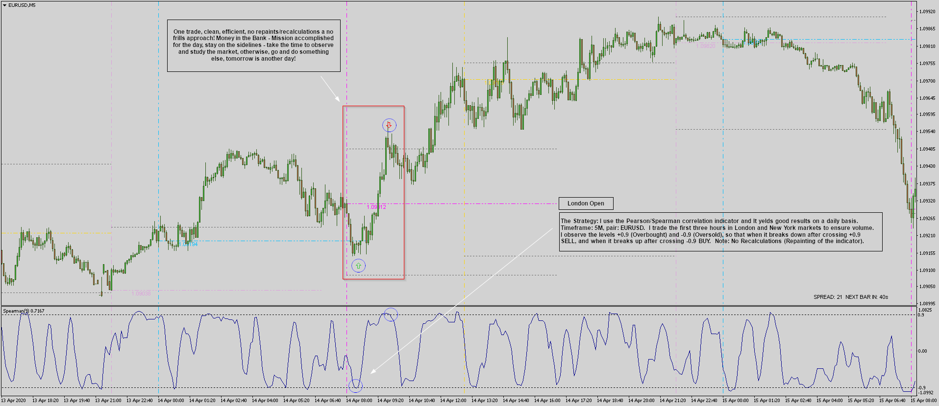 How to trade: I use the Pearson Spearman Correlation Indicator and It has given me consistent returns. Timeframe: 5M, pair: EURUSD. I trade the first three hours of the London open and New York open markets to ensure volume. I observe and use for signalling the levels +0.9 (Overbought) and -0.9 (Oversold), so that when it breaks down after crossing +0.9 SELL, and when it breaks up after crossing -0.9 BUY. NO REPAINTS !!!