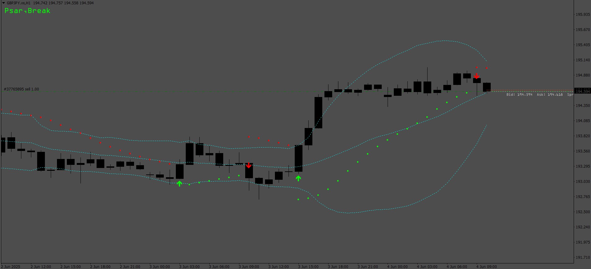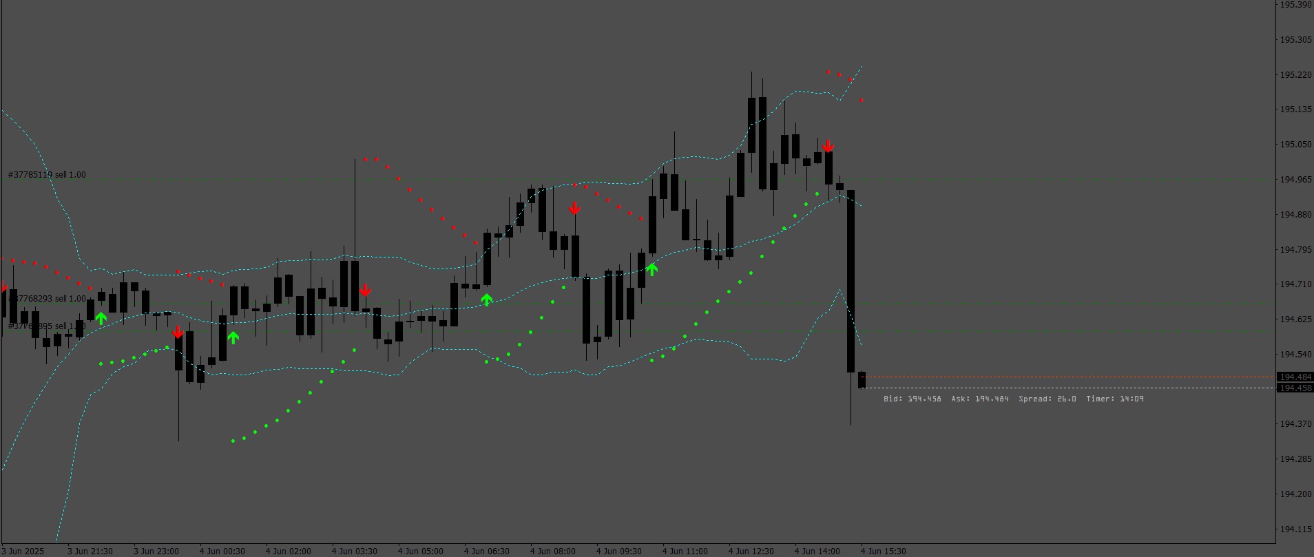 Price has attempted to break the outer bands but is contained within the Bollinger Bands (Blue), signaling a "Sell" scalp trade opportunity