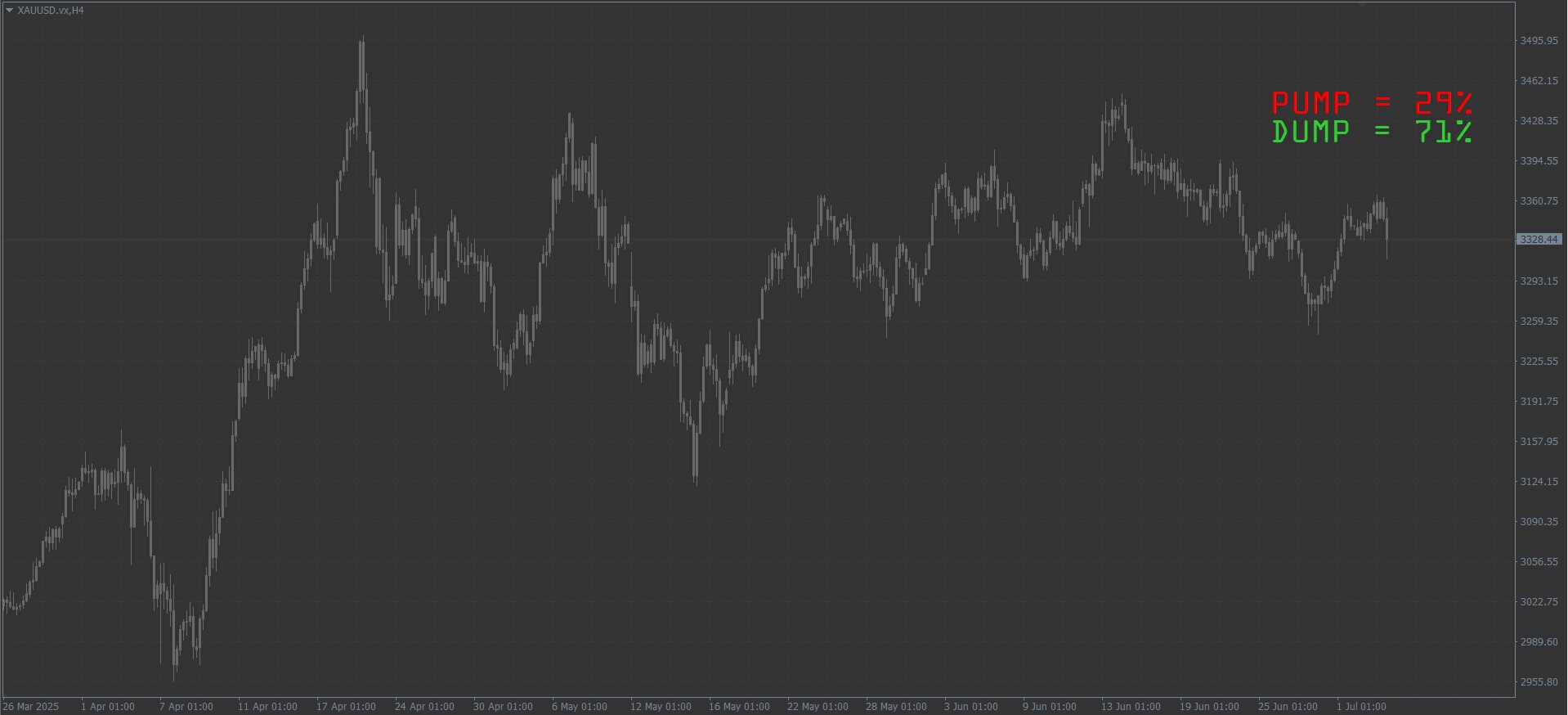 It then aggregates all this information, applies user-defined weights for each timeframe, and calculates a final "PUMP %" (Buy Strength) and "DUMP %" (Sell Strength). This result is displayed directly on the chart, and it can trigger alerts when these percentages cross user-defined thresholds.
