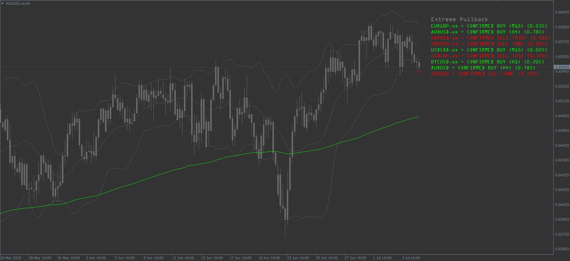 Function: It is a scanner and dashboard. It does not draw continuous lines like a moving average. Instead, it scans multiple currency pairs and timeframes for a specific trading signal and displays the results as a text list on your chart. It can also provide pop-up alerts and draw arrows for confirmed signals.