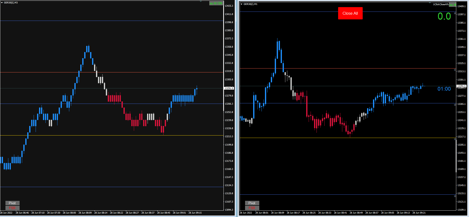 Dax pivots & XU hl colour candles - Renko 10 point (rail to rail) Vs M1.