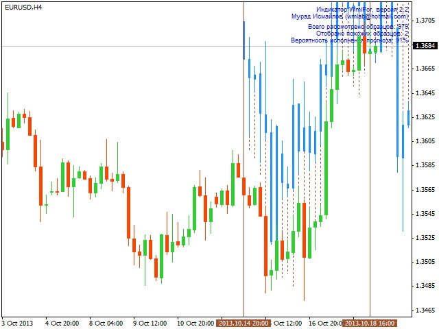 If similar patterns of behavior on history are found to be small, the indicator will advise to weaken the stringency of the comparison by decreasing the value of the ScalePercents parameter (in the screenshot above). It should be remembered, however, that the forecast becomes less reliable in this case.