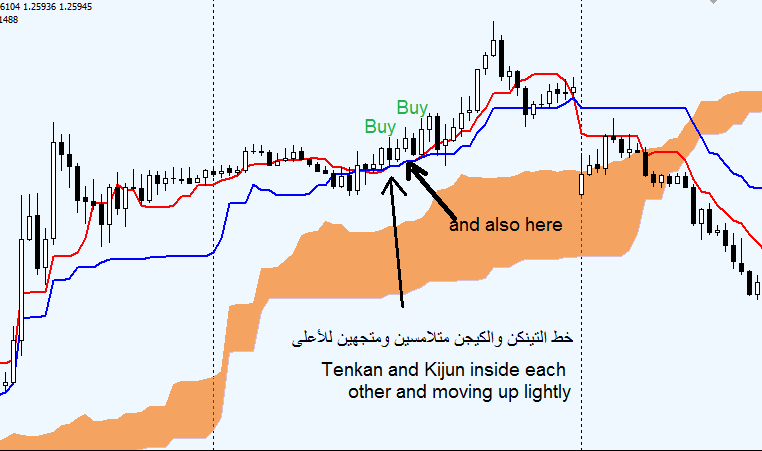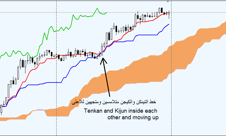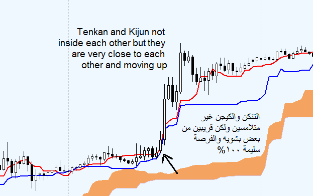 This indicator shows buy & sell arrows with alerts when (Tenkan and Kijun) are inside each other and moving together in one direction, or they are very close to each other..