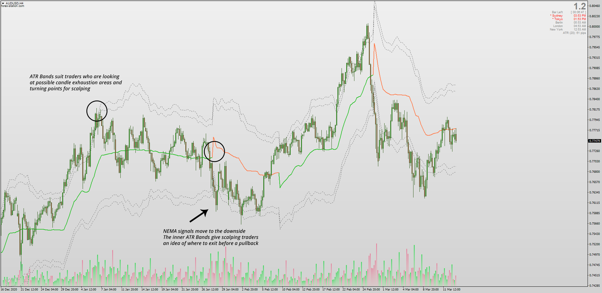 • Use the ATR bands for predicting possible reversal areas and candlestick exhaustion