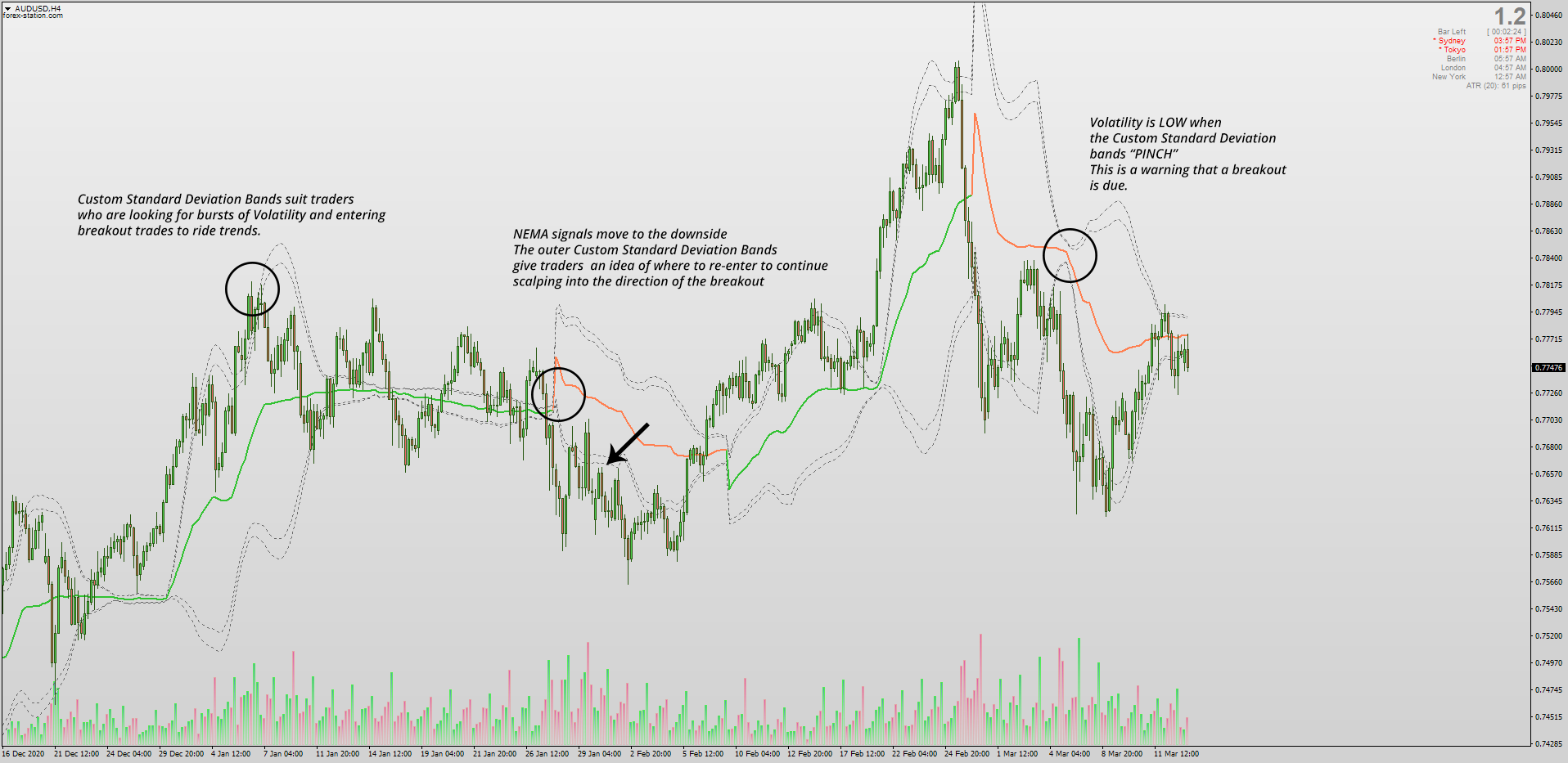 • Use the Custom Standard Deviation for entering breakouts and forecasting Volatility whenever the bands "PINCH"