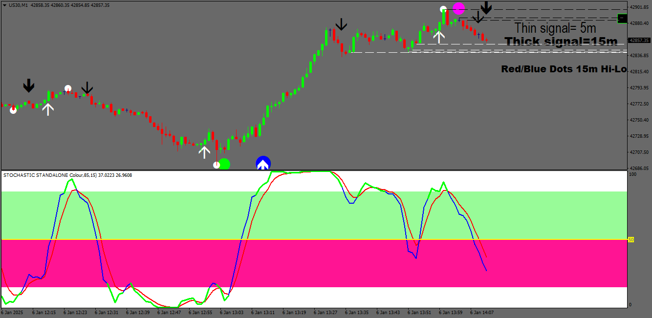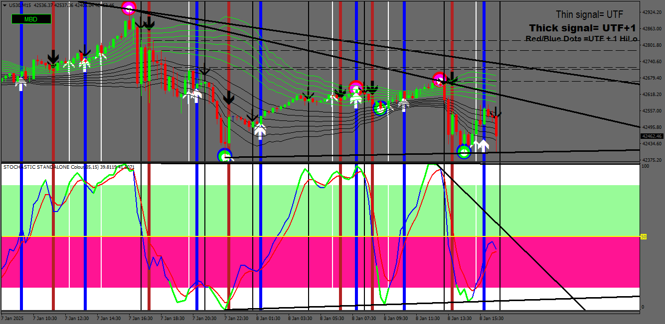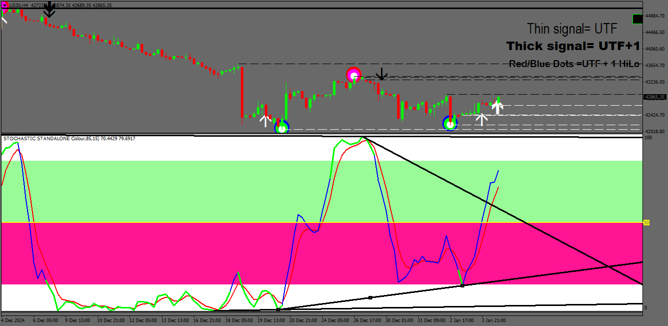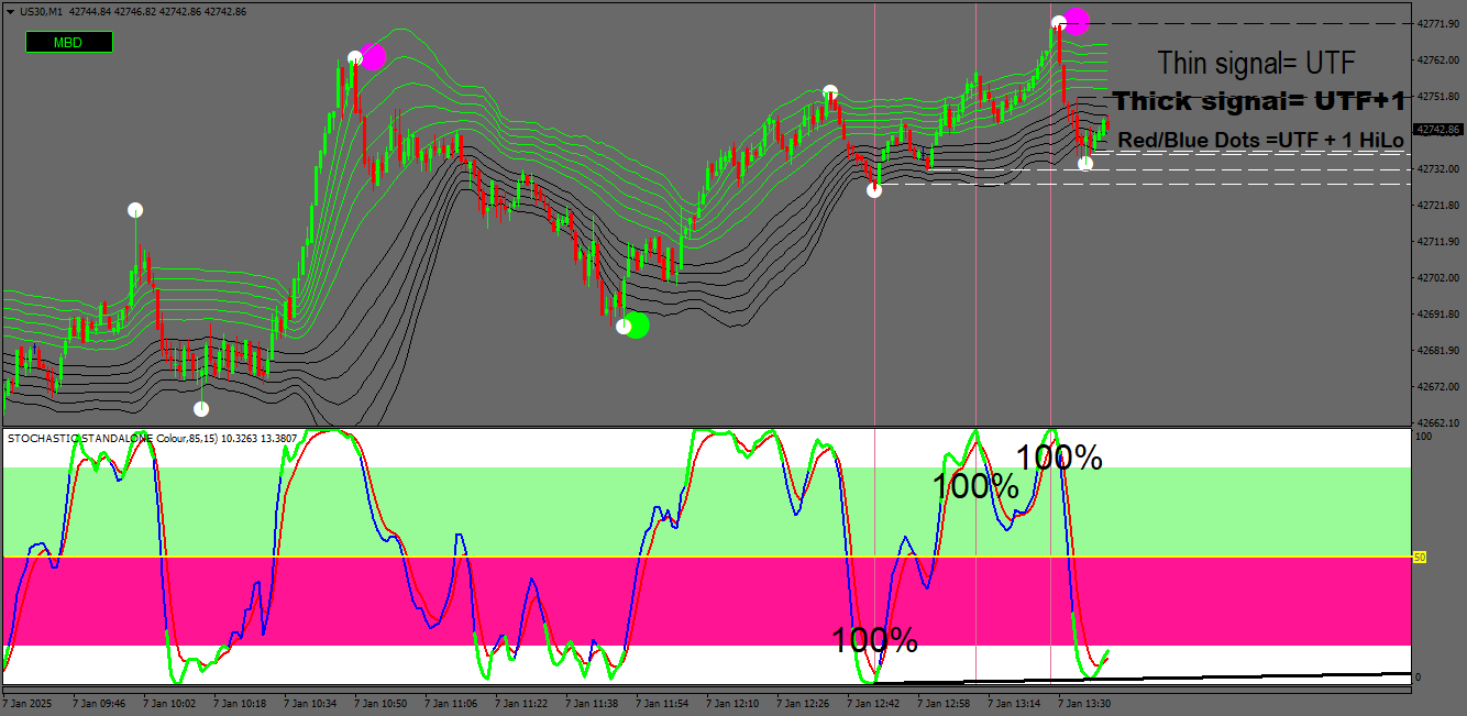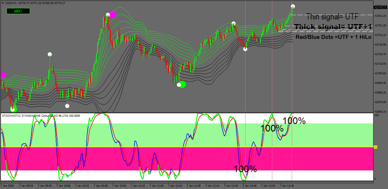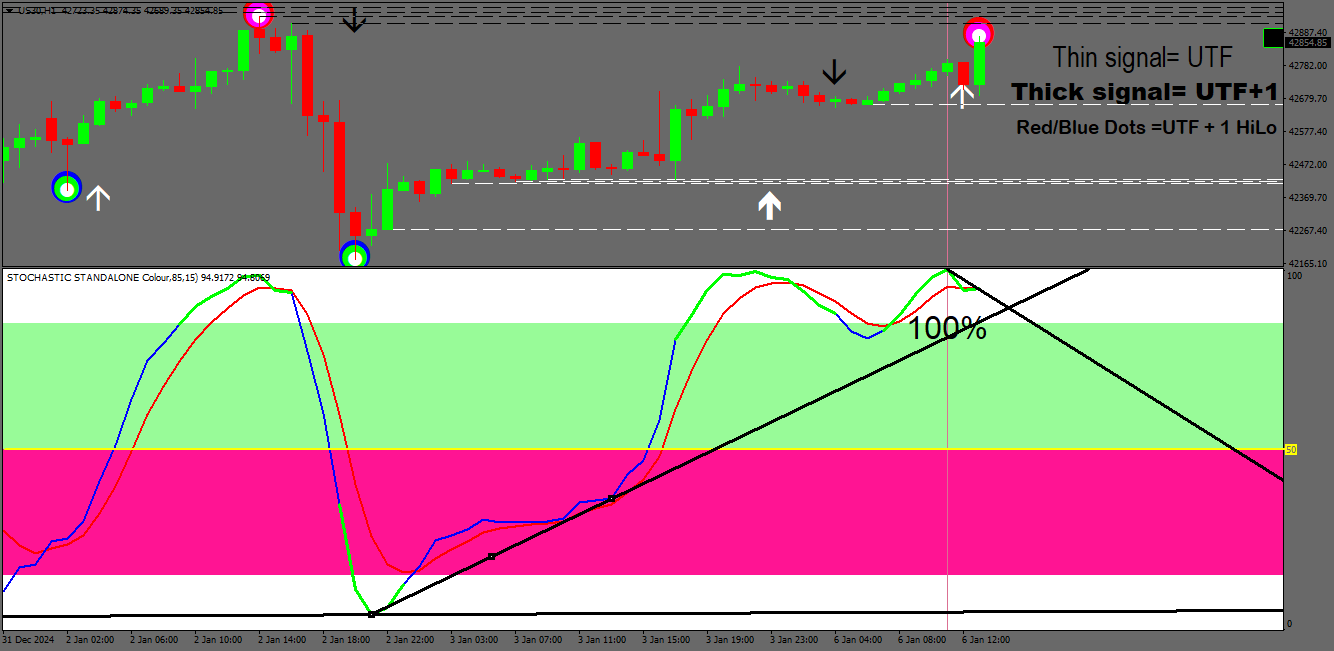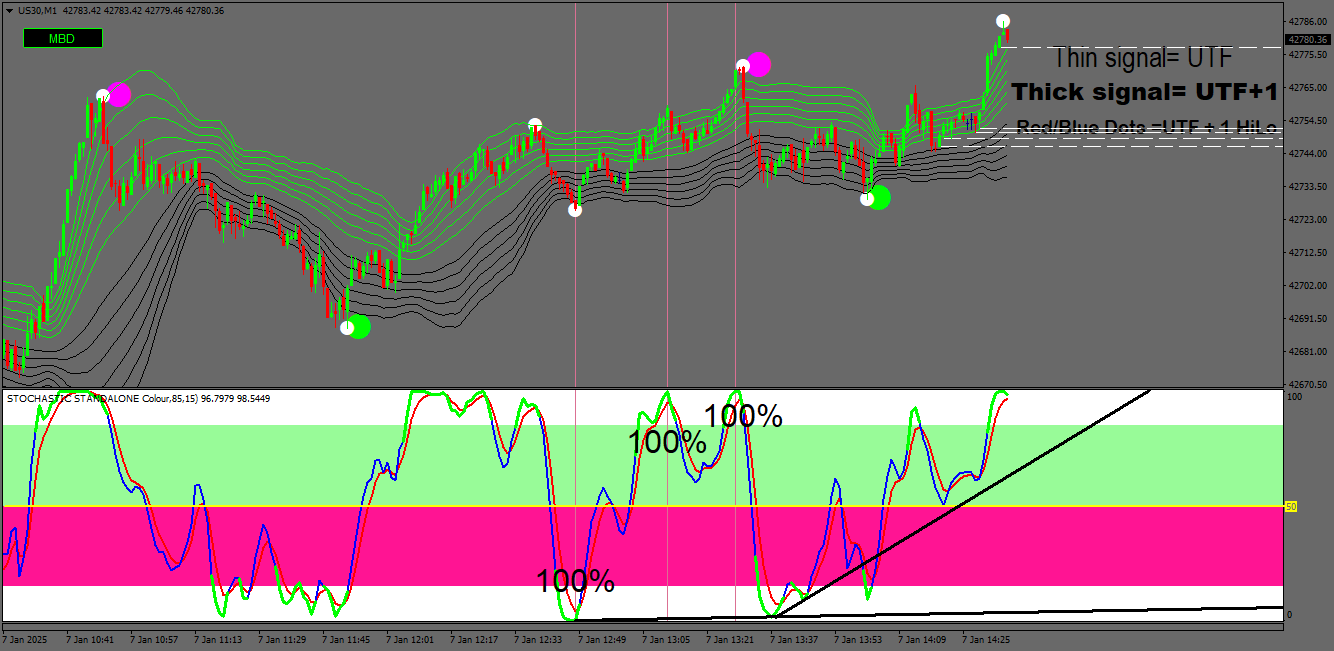The traps I draw use the exact numerical data as is on the stochs (by placing the cursor over the stochs it gives this information. Very easy to do on the upper times frames but the 1m timeframe is a very much more urgent.