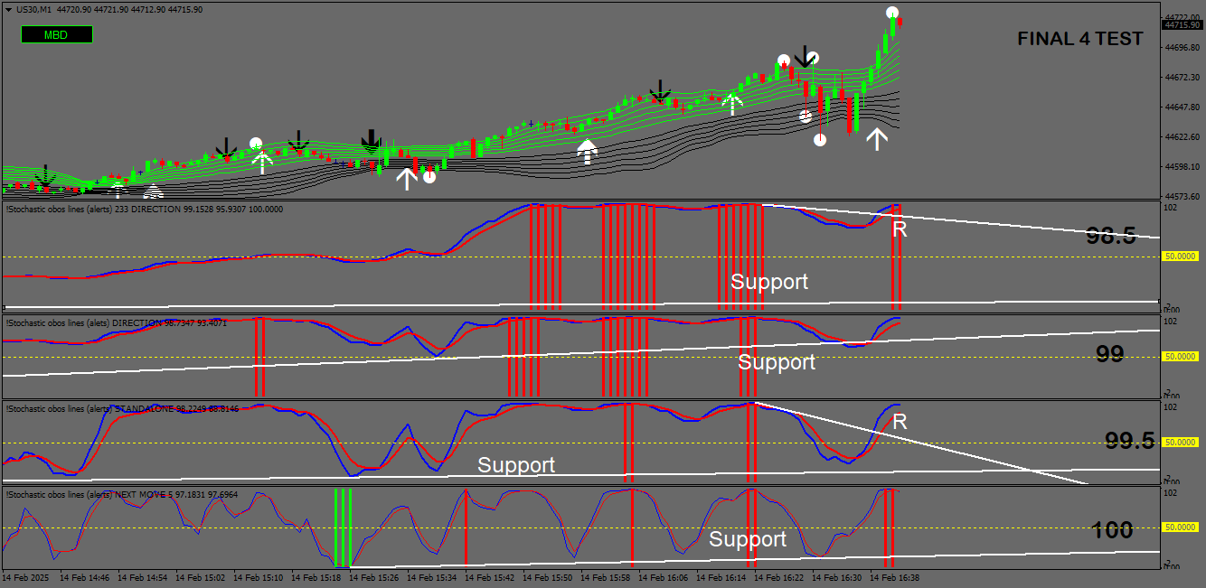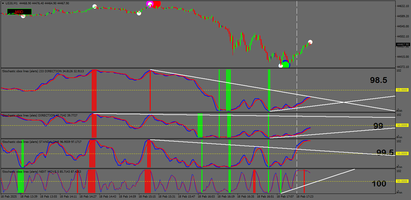 The attached illustration - US30M1 The perfect entry continuation - would have provided a trader with AT LEAST 250 pts.