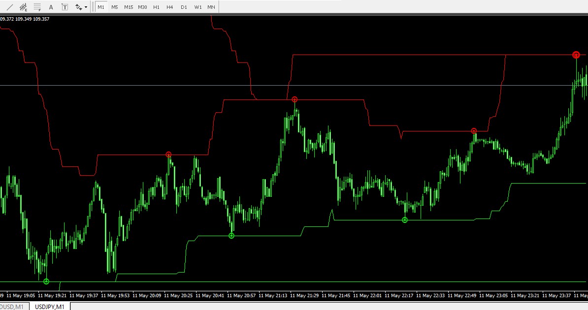 From looking at the code looks like it has a channel already, try adding SetIndexStyle(4,DRAW_LINE); ,SetIndexStyle(5,DRAW_LINE); ,SetIndexStyle(6,DRAW_LINE);, SetIndexStyle(7,DRAW_LINE); on buffers 4 thre 7.