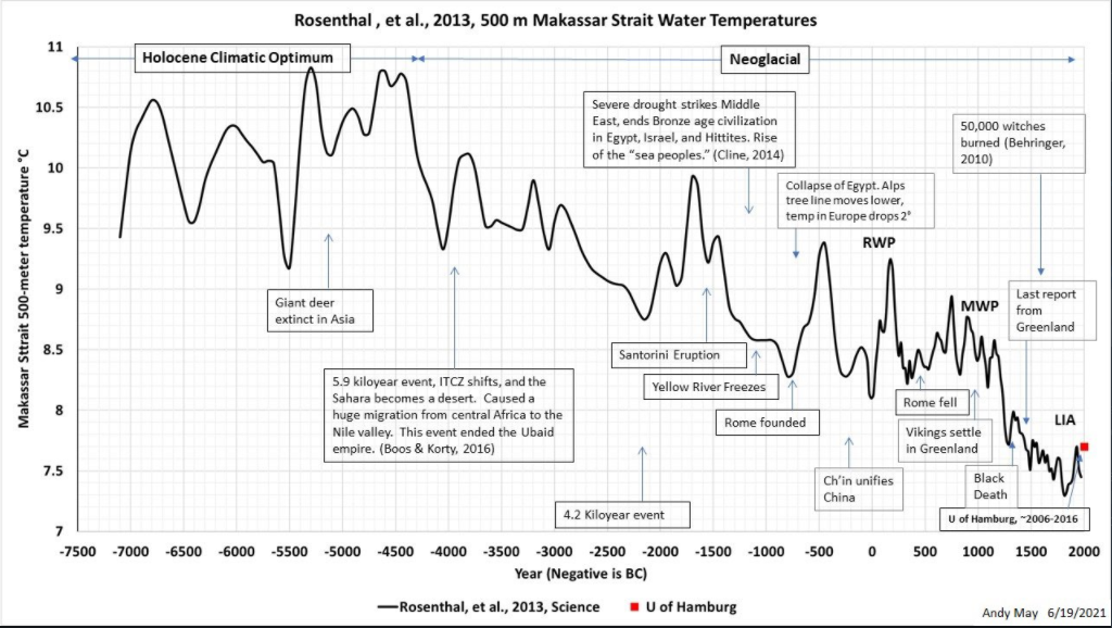 The world is on a one-way conveyer belt to the frozen landscapes of crushing glaciers in an arctic world. Falling temperatures for 8,000 years have seen occasional warm pulses. But the signs are ominous. The United Nations is running a blatantly dishonest global warming scam.