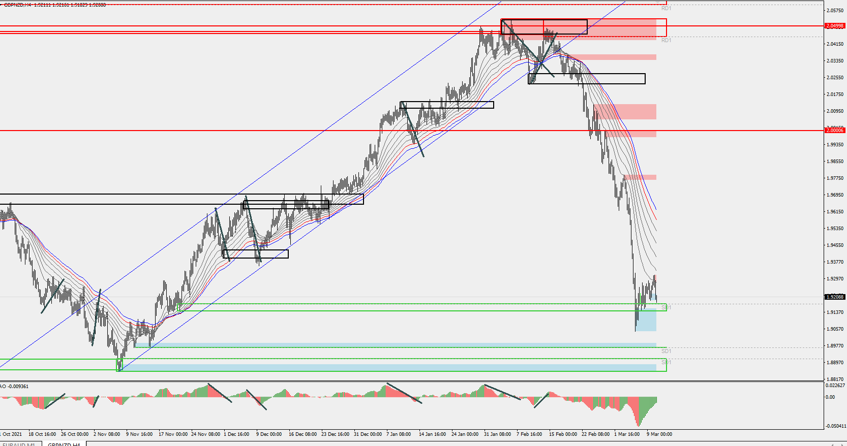 by request a few charts on the higher timeframes. this is gbpnzd 4h chart. nice bounces on daily SD's. 2 top = reversal pattern at the high. at the low inverted Head and Shoulder as conformation. the MA's as guideline for the 'trend'