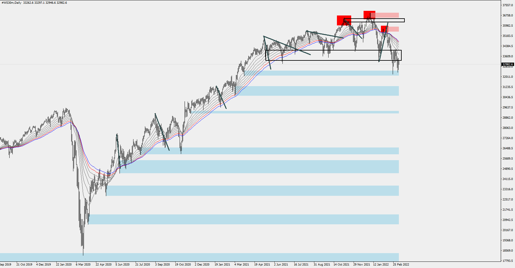 Dow daily. nice run up and clear down in February. price could not make higher highs; Head and Shoulder if you want (red boxes)