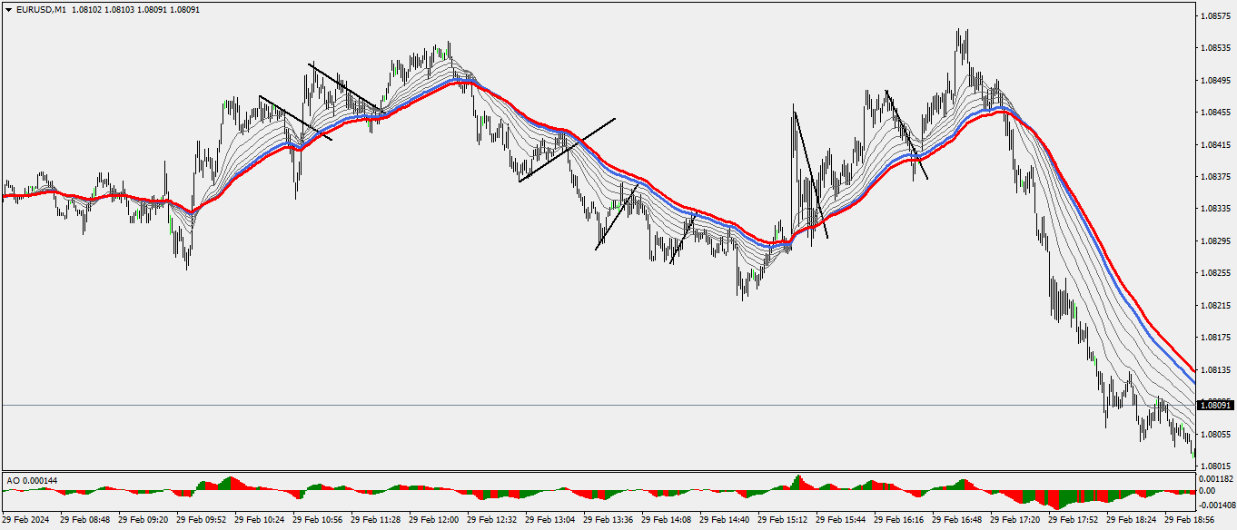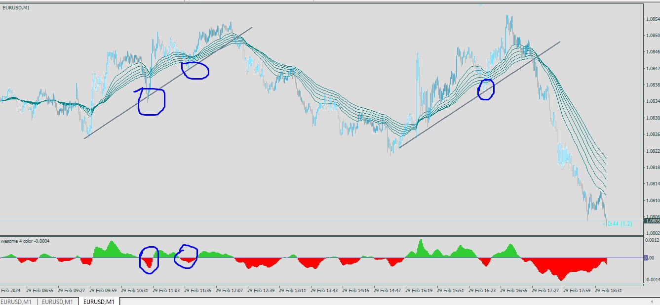 M1 chart shows the price change direction to trend down (ma change the direction also
