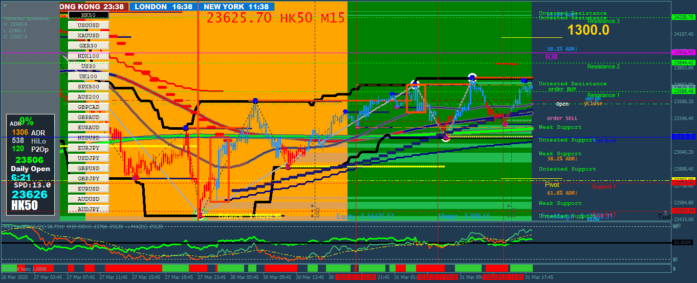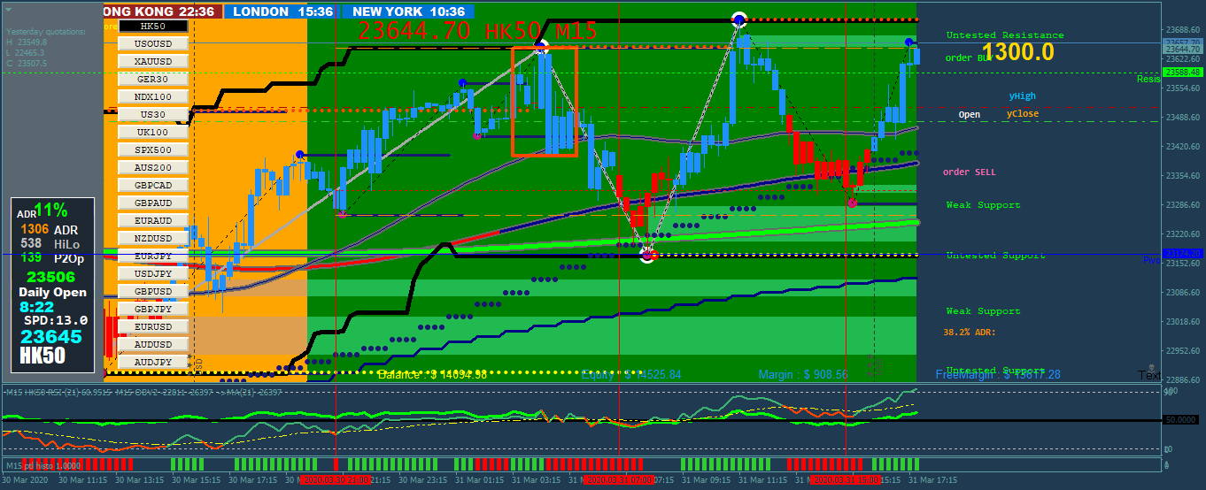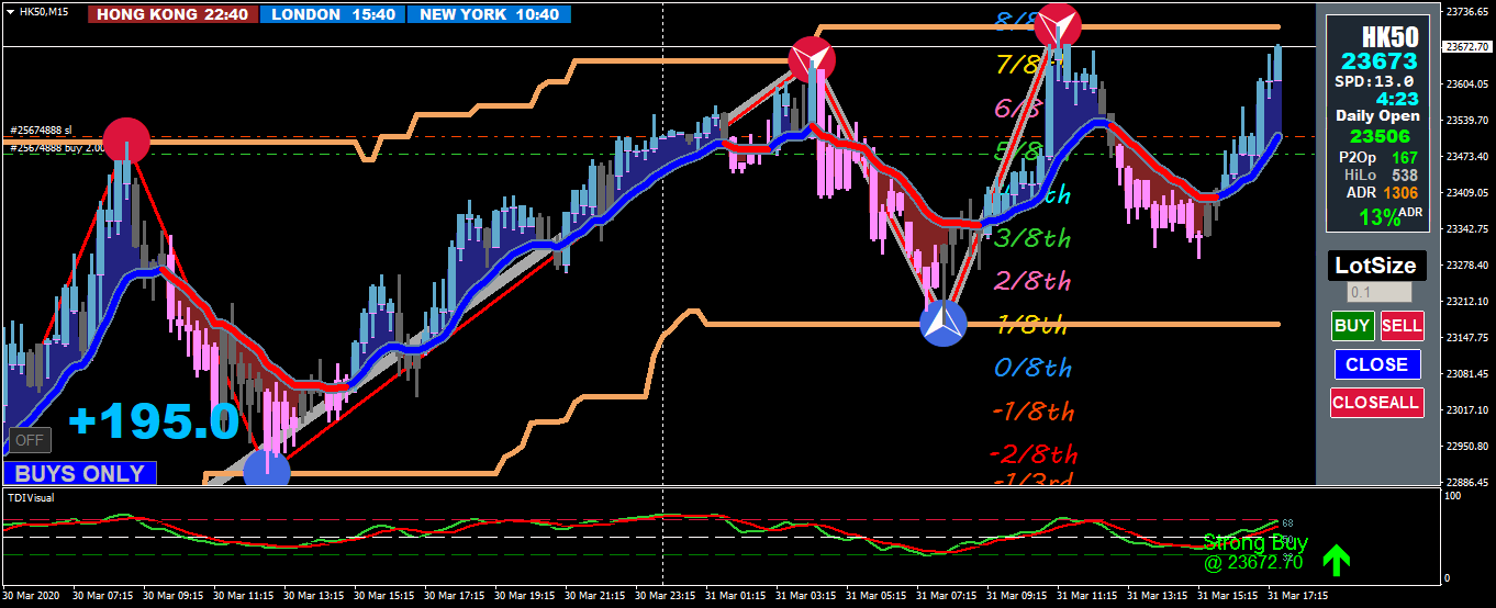 I managed to get a buy entry late into the US session on the HK50 using my own algo to fit my trading style though certain indies have been incorporated from Xards trading system- thanks to Xard....Trend following is always key; however, one needs to also take into consideration that markets will only trend 30% of the time (Global uncertain periods such as we have now will likely consist of shorter intra-day trends, choppy and ranging markets vs long term trends) ..Thus, using basic principles such as the Elliot wave theory, divergence and price action will eliminate most false trade setups; indicators whatever the system may be should be used by one only to serve as secondary confirmation systems following price action.... This is how the trade setup would look like on the Xard system...