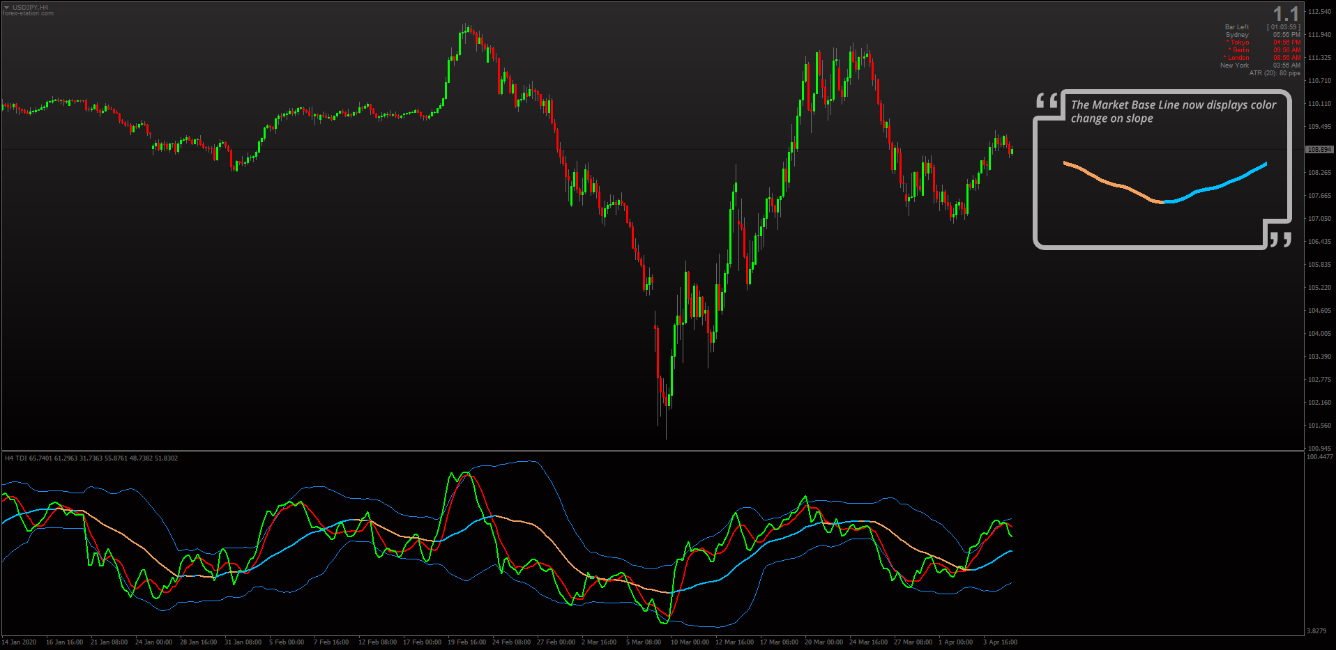 Mrtools' latest update of the TDI 3. Now with non-repainting Market Base Line that changes color on slope (as posted here):