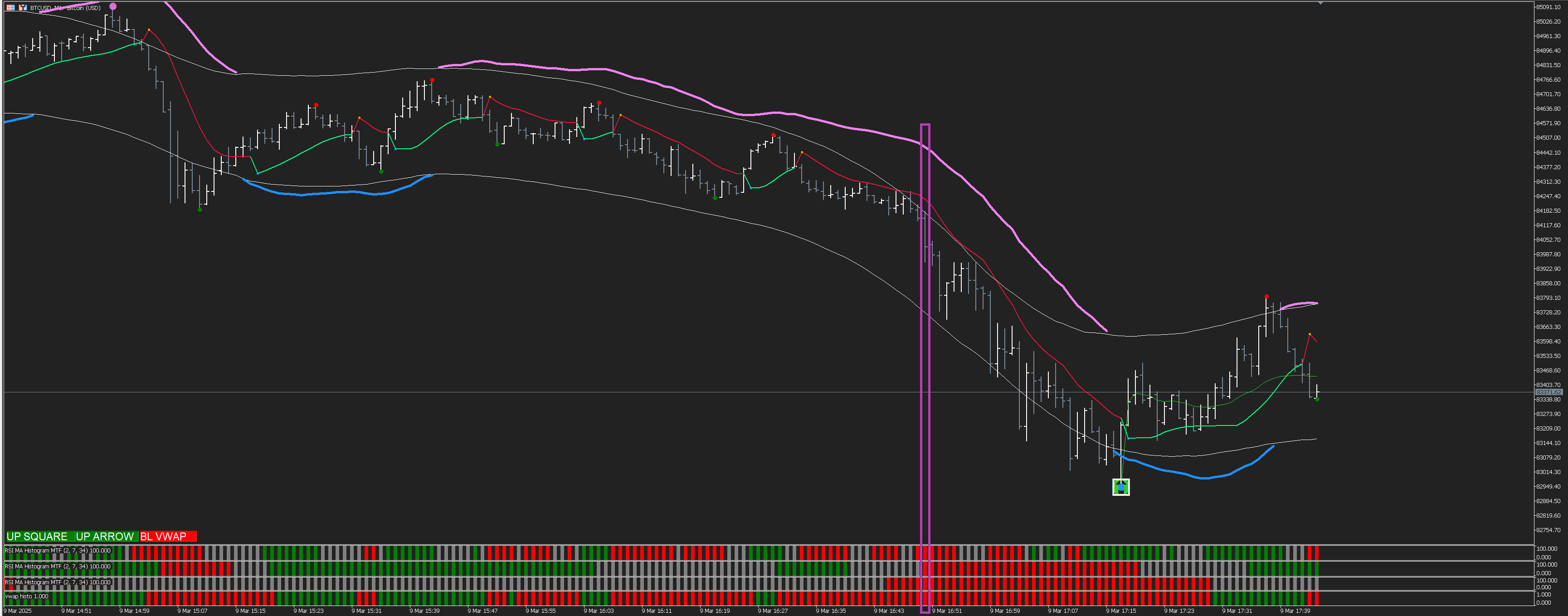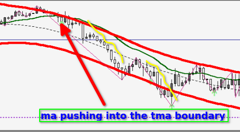 Below is a "trading suggestion" using the tma as a guide to direction along with the dots indicator from Kvak.