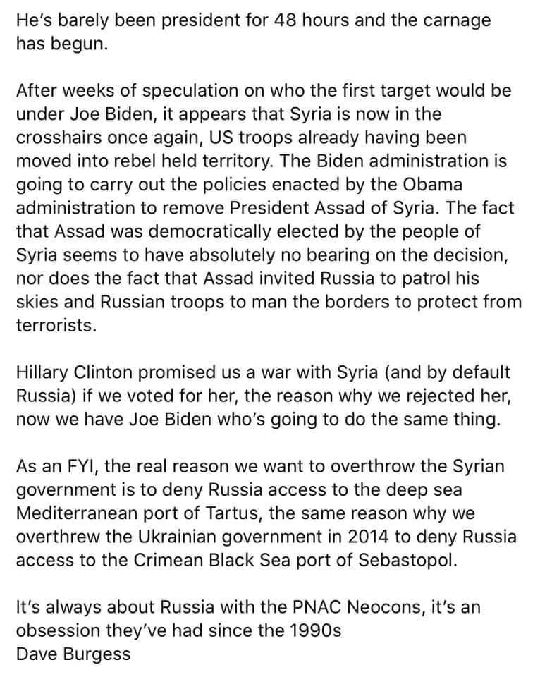 263His first hour in office biden eliminated close to 50K jobs, and now apparently the warmonger sending troops into Syria, less the 24 hours after taking office against Syria's wishes. Wow just wow!!!!! "A large convoy of U.S. military personnel headed into Syria on Thursday along with hundreds of troops some 24 hours after President Joe Biden took office and took on his commander-in-chief role, foreign media reported.