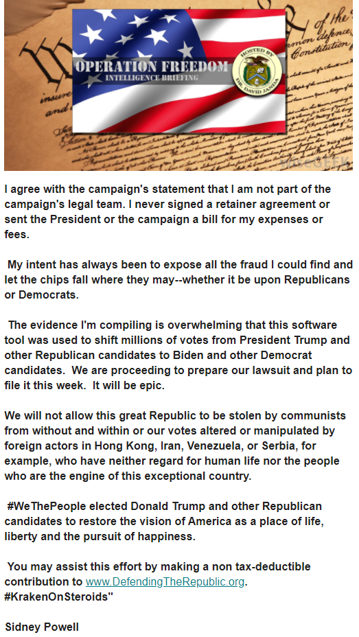 ''Sidney Powell is practicing law on her own. She is not a member of the Trump Legal Team. She is also not a lawyer for the President in his personal capacity”