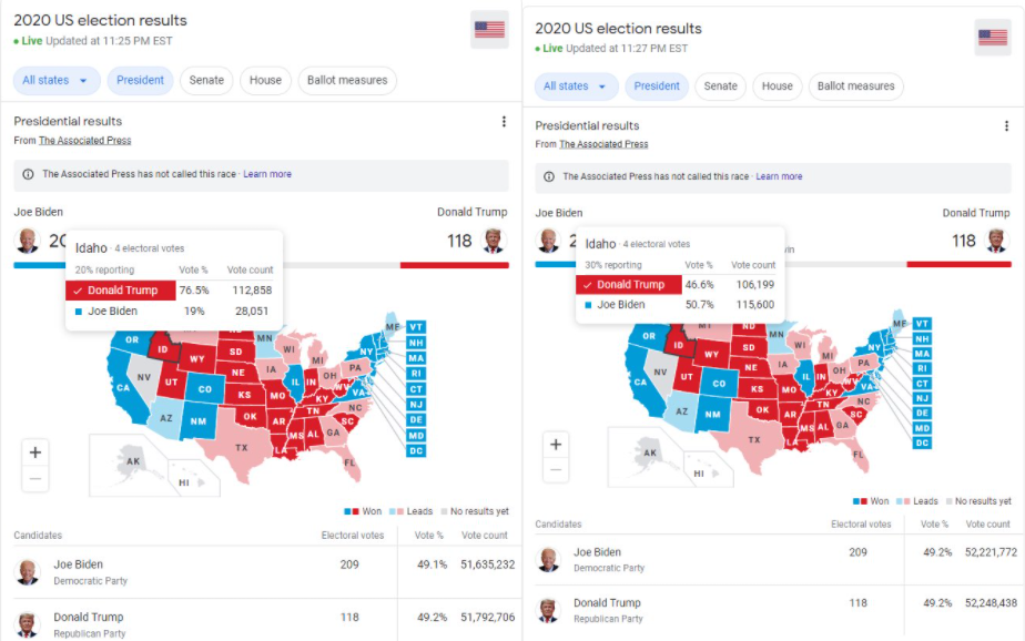 99Election night Trump loses over 6,000 votes in the space of 2 minutes, very careless imo. 'Lucky Joe' Biden on the other hand picks up 85,000, well done mate!