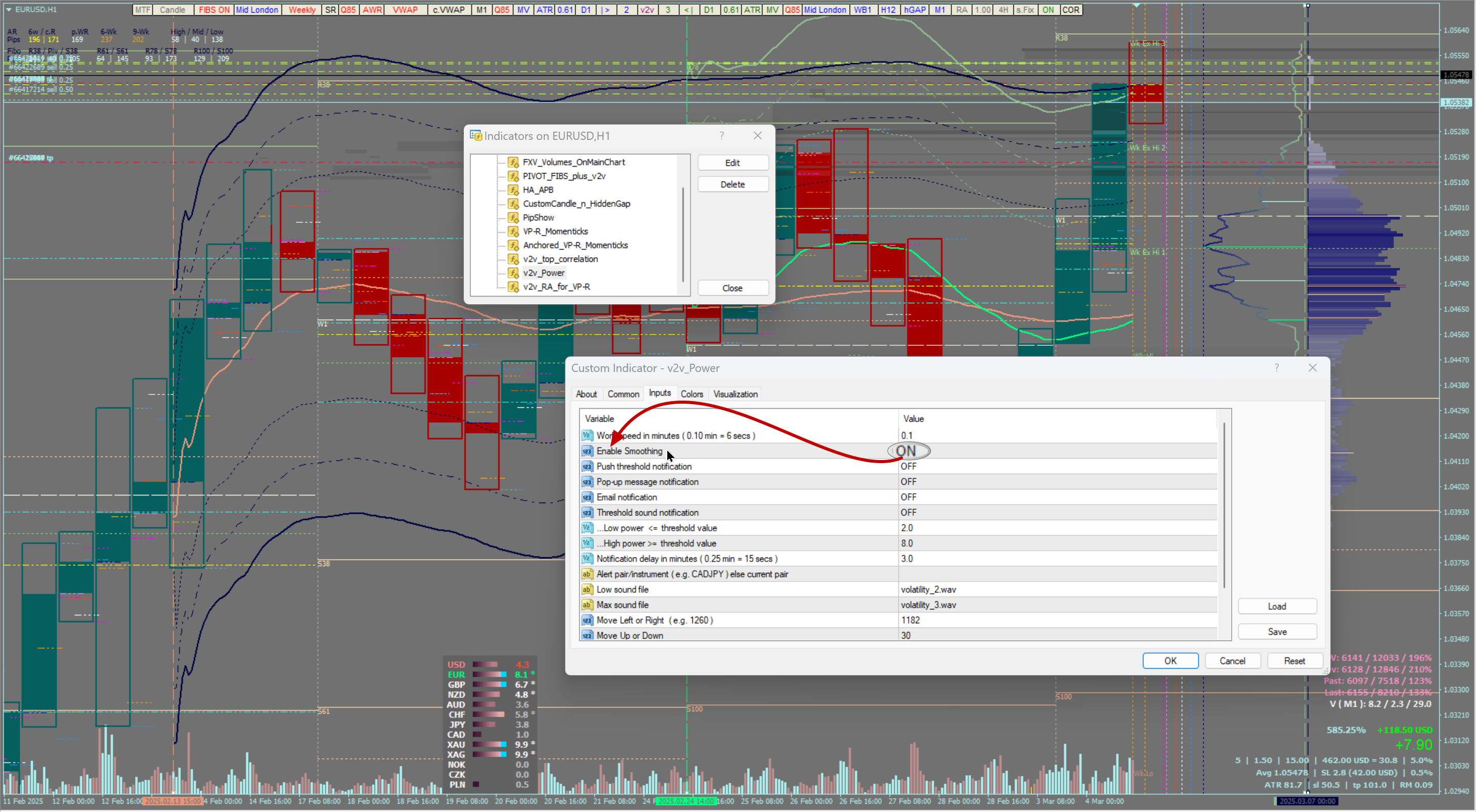 v2v Power ...currency strength indicator with smoothing factor (EMA)