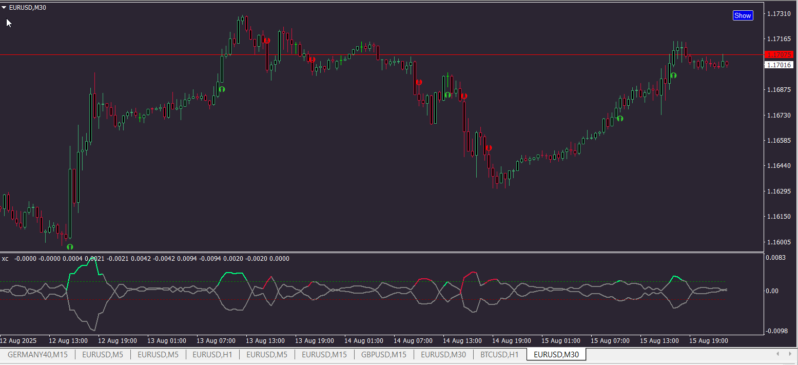 1550kval If you would be so kind, could you tell me what the top indicator is that colors the candles and shows the horizontal lines?kvak wrote: Wed Aug 13, 2025 6:49 am Combo X8: RSI + CCI + MACD + ADX + Ultimate Strength Index (USI) + Keltner Channel + Stochastic & Moving Average System