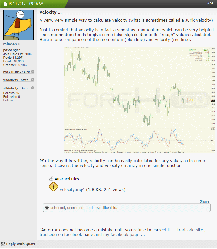 This is Mladen's Velocity indicator. It has been previously posted but to make this thread more complete, I'll re-post it here with Mladen's explanation in case someone is looking for it!