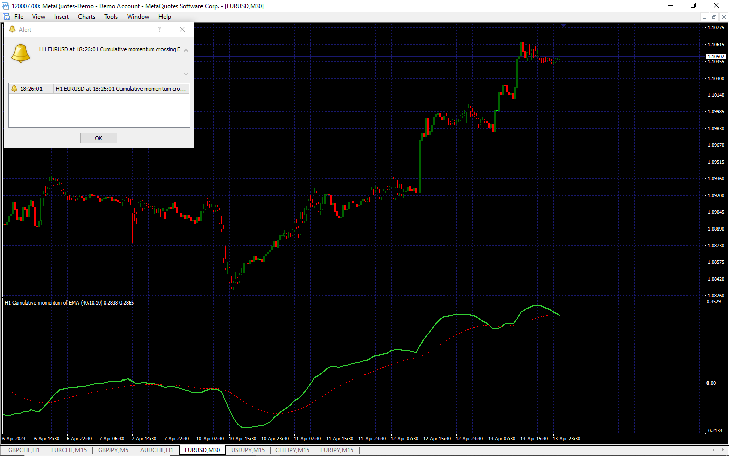 TMO Oscillator Calculation: The indicator calculates a custom version of the "True Momentum Oscillator" (TMO) using the selected time frames. It then smooths the oscillator data with EMA (Exponential Moving Average) and generates signals based on the crossovers of the main and signal lines....