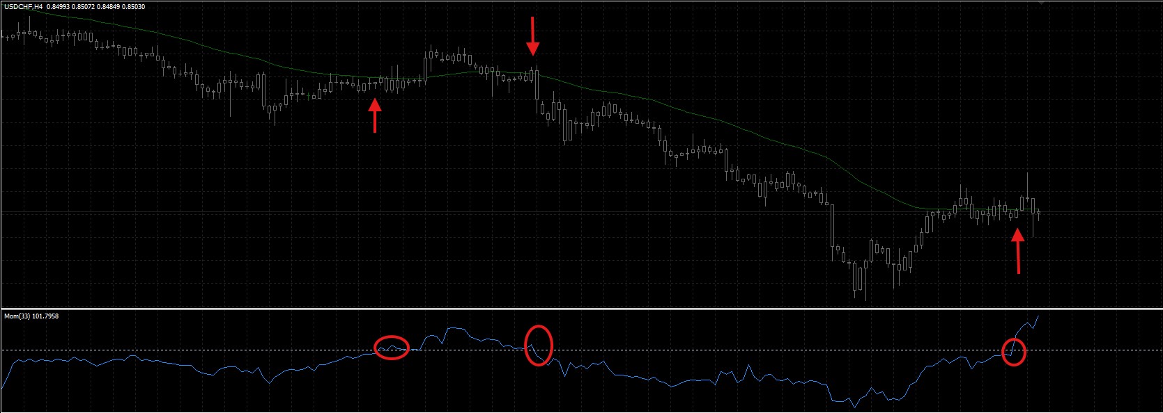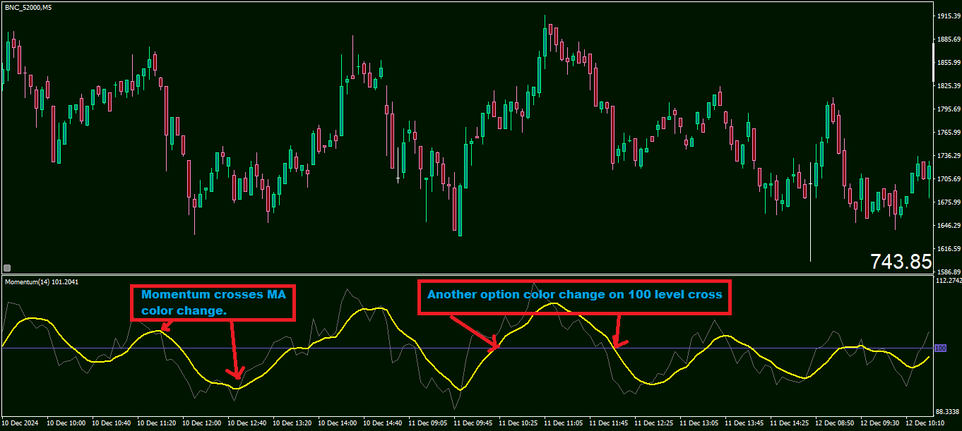 14 momentum cross 10 MA (better all averages) .momentum line crosses MA color change and another option is MA color change on 100 level cross.