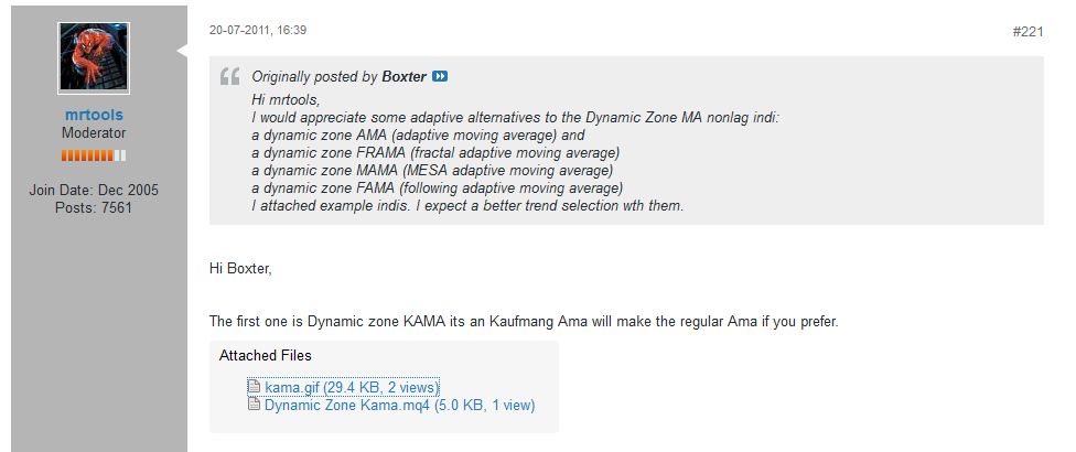 The Adaptive Moving Average (AMA) aka Kaufman Adaptive Moving Average (KAMA) was created by Perry Kaufman and first presented in his book Smarter Trading (1995). This moving average offered a significant advantage over previous attempts at ‘intelligent’ averages because it allowed the user greater control.