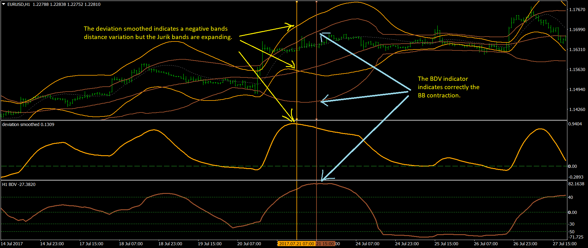 thank you very much for the indicator. I think we are very close to the correct result nevertheless I have noted that sometimes the indidicator do not represent correctly the bands distance variation. Look at the picture : the BDV indicator report correctly a contraction of the Bollinger Bands while the deviation smoothed indicates for the Jurik Bands a diminishing band distance variation while the bands are expanding ( bands distance variation increasing ).