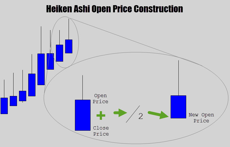 If you look at the formula carefully, it makes each new Heikin Ashi candle open in the middle of the previous candleâs bodyâs range.