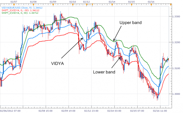 Where: F is a smoothing factor calculated by the formula: is a number of periods for Exponential Moving Average (EMA); is the absolute current value of Chande Momentum Oscillator (CMO); is the value of VIDYA in the previous period. Usage Usually not VIDYA itself is used in trading, but its upper and lower borders (bands), that are by N% above and below VIDYA.