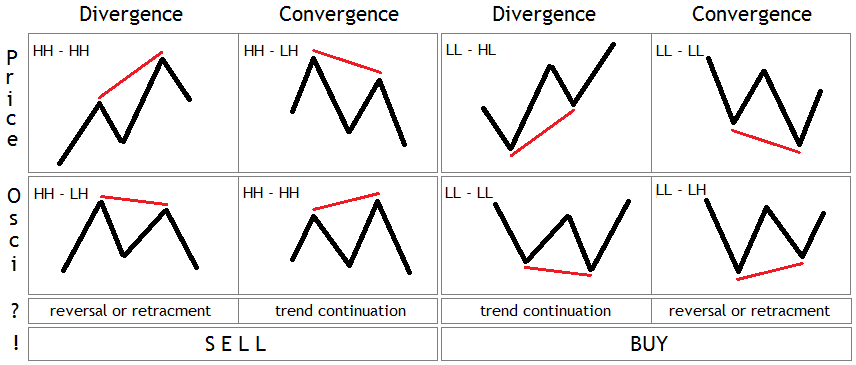 It is a very good early-warning sign that the market is getting weak or strong and that you can tighten your stops or prepare for exit or entry. Which osci you use is up to you. I recommend a momentum setup (short periods) and here RSI/RSX, MACD and Stochastic have a similar results. The behavior between the Highs and Low aren't of interest. You can also take A/D line or Value Charts for more Divergences and Divergences from higher tfs are also very useful. Trend continuation, reversals like trend exhaustion or retracements, decide what you need for your trading style and look for those odds.