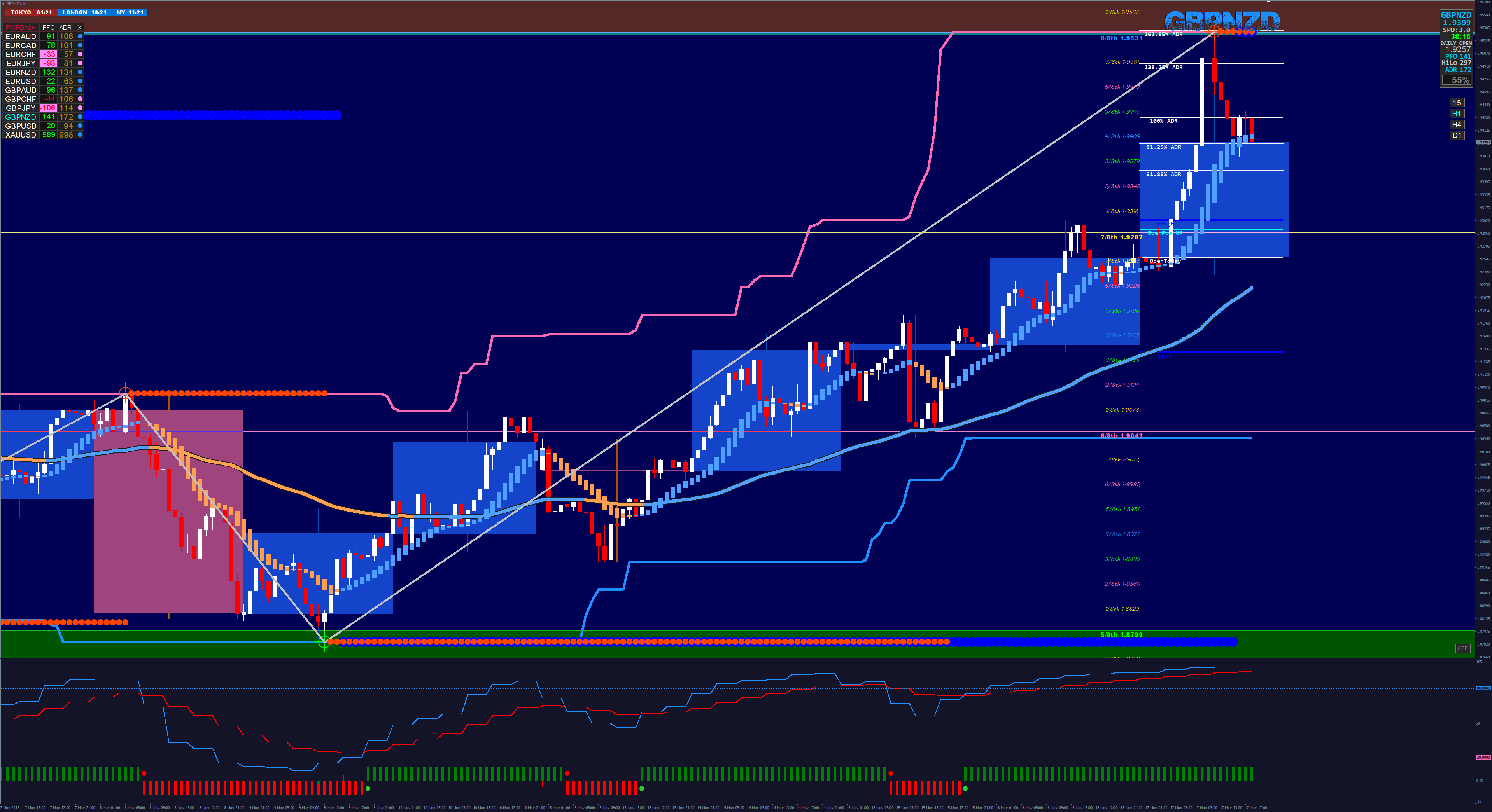 Basically, my viewing arena consists of a 1hr canvas to which I place higher 4hr turning points and look to trade a series of compounded trades using smaller 15min turning points within the 1hr channel until the next 4hr turning point is met. I am not used to this type of trading so I am having to adjust my habits and apply myself to this strategy. What I do like about it is the ability to compound and I have always believed this to be the only way to make serious money in forex.