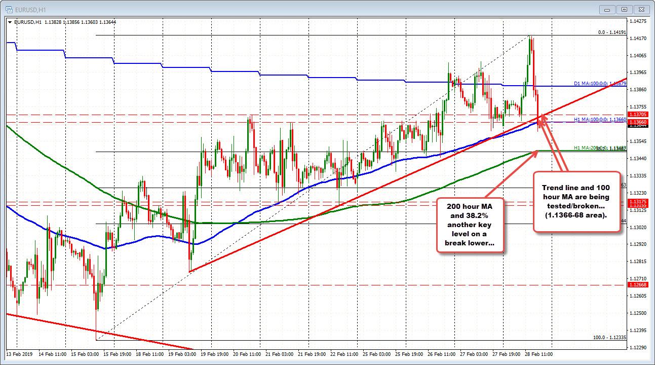 The pair fell back below the 100 day MA earlier, traded around the level, and is now making a run below the 100 hour MA (and trend line) in the 1.1366-68 area). On more downside, the 1.1348 is home to the 38.2% of the move up from the February 15 low, and the 200 hour MA (green line).