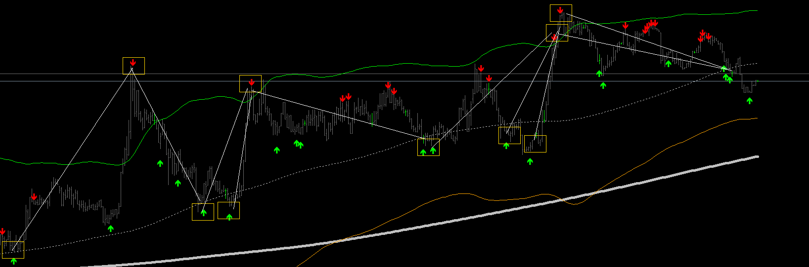 Yeah thanks, looks good in FX too. In uptrend, buy when arrow under middle line and sell when arrow above upper line. and downtrend vice versa.
