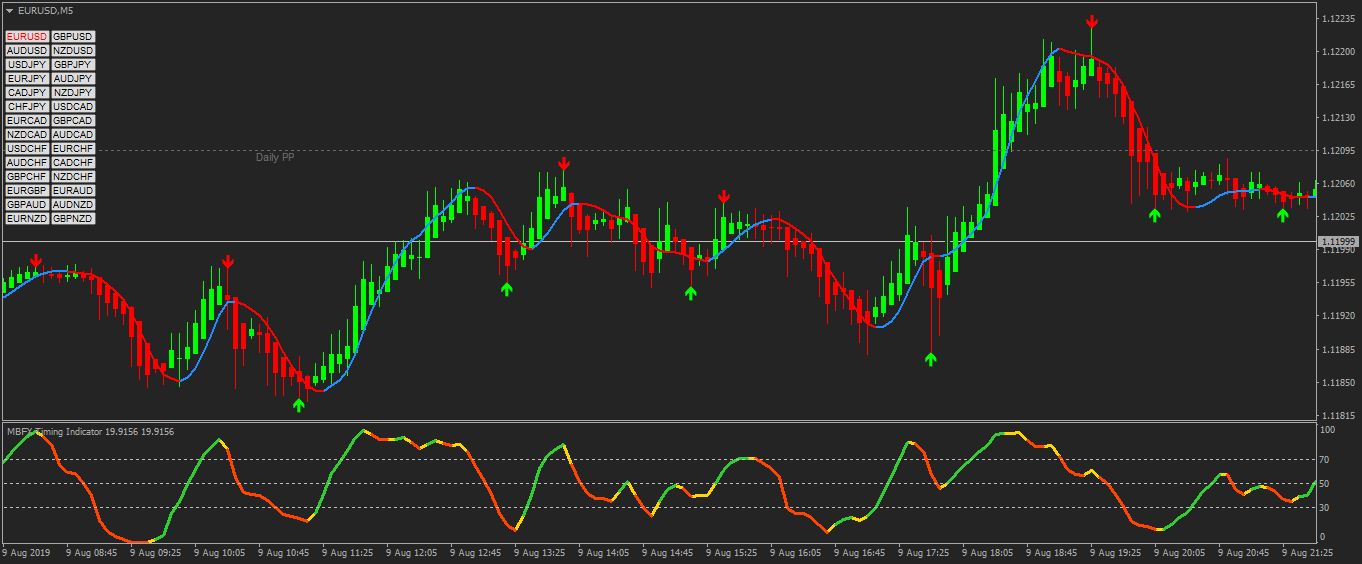 MBFX Time tricolor oscillator that shows the current direction of the market trend. Green indicates the upward trend, orange = to downward trend. Yellow = transition, usually indicates the presence of the flat.