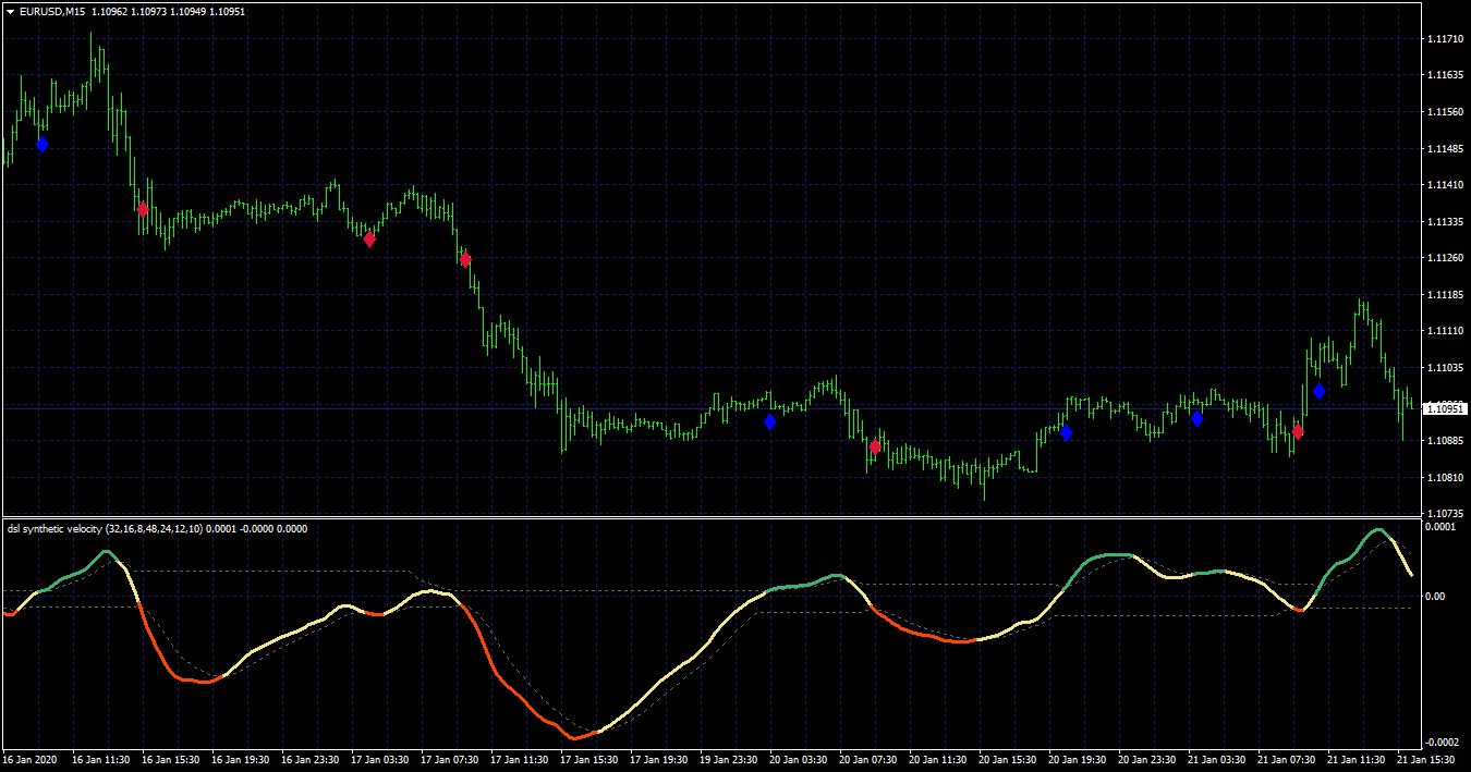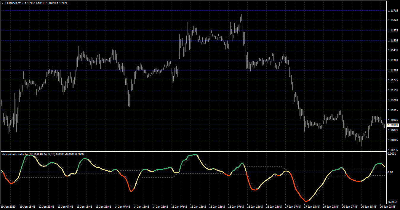 171This is a discontinued signal line synthetic velocity, indicator has a choice of averages and average periods for the calculation along with 3 periods of velocity and the various price options. Coloring is done with the synthetic velocity leaving the dsl signal lines.