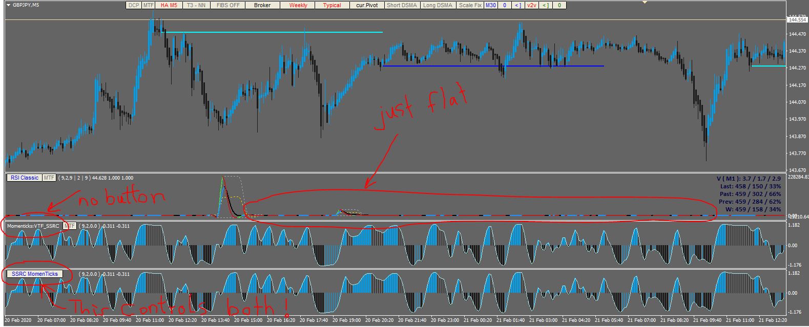 Thanks for taking the time. But I still get flat lines on the lower time rames and zooming doesn't help with this . also, when trying to add another instance of the momenticks indicator the button for the first one disappear and for some reason they end up being linked so that the button of the new instance controls both when trying to change the displayed output.... could you please verify