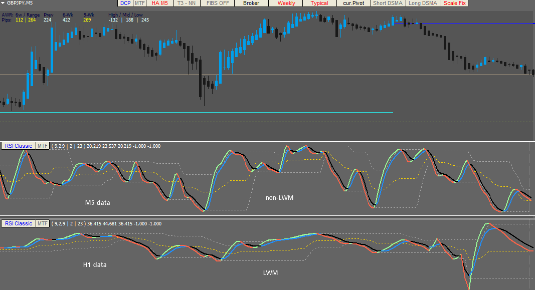 Zoom-in or use MTF ... the data (current TF tick data) is too small or has some type of issue on tick data to be shown correctly by LWM algorithm. If I simply adjusted the algo for a lower time frame or specific pairs it would kill the idea of linear-weighted momentum resulting in inconsistencies or producing more false directional momentum or entirely redesign the system with the traditional or common overbought levels which destroy the discretionary or dynamic setup of this system (and I will never ever go that way).