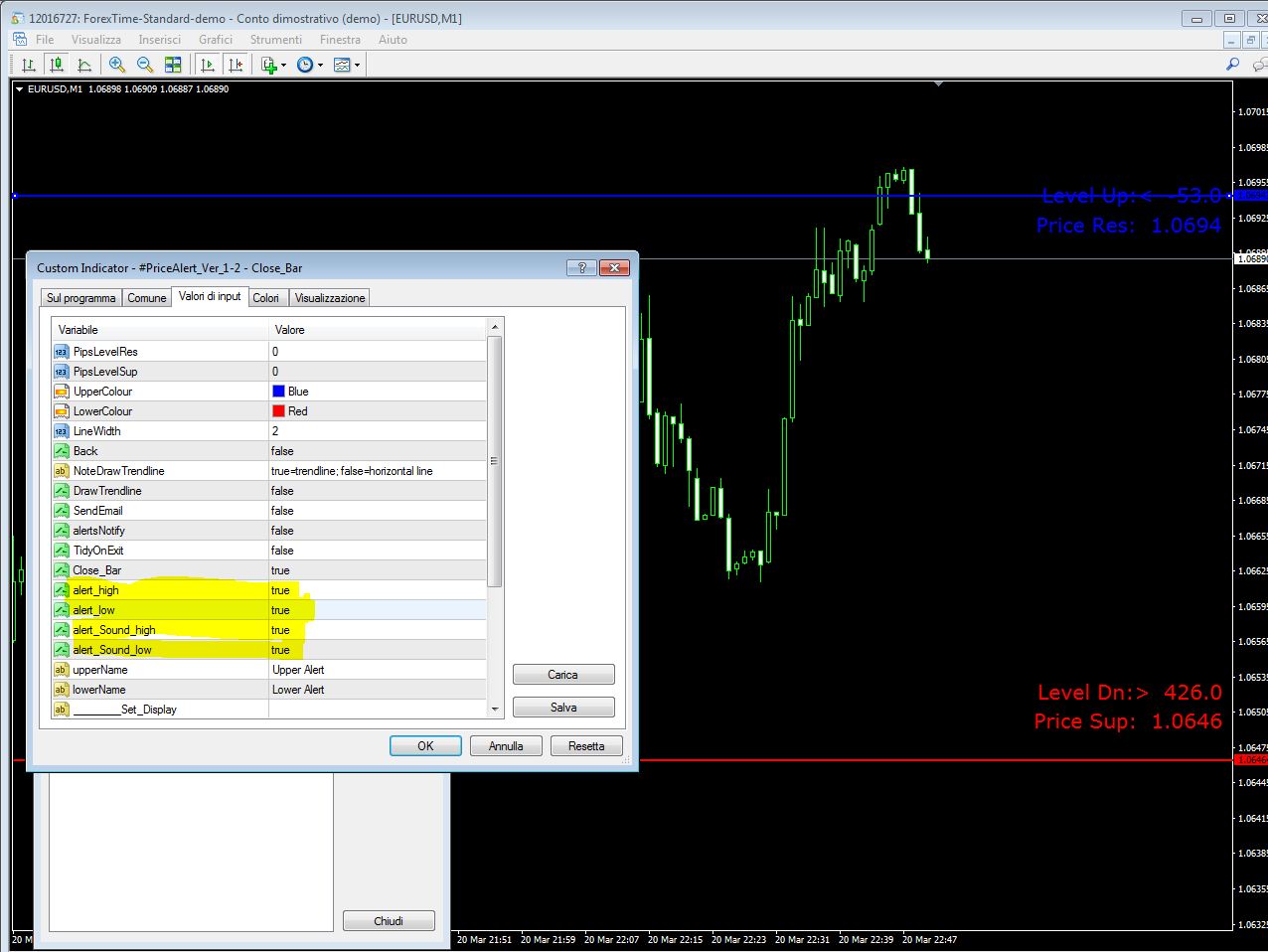 I'm testing on the one minute chart now and the alerts aren't signaling. What settings should I have for it to trigger..AGAIN, SUPER THANKS!!!!!!