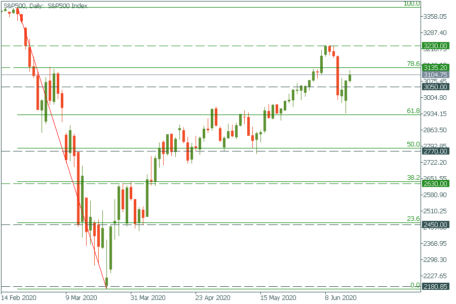 S&P 500 has rebounded after the huge fall during the last week. Now S&P 500 is moving up towards the 78.6% Fibonacci retracement level at the 3135 mark. If it breaks through it, then the price may rise to 3230. Support is at 3050.