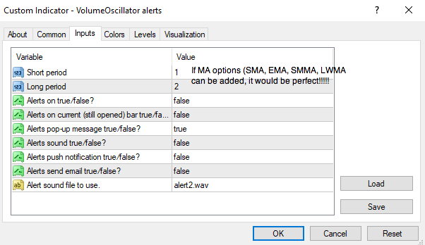 I asked for alerts when a bar crosses the MA on the Cumulative Volume (CV) indi and/or edit the Volume Oscillator (VO) indi. I figured out a solution that is exactly the same as the CV with the VO. If standard MA options (SMA, EMA, SMMA, LWMA) can be added for Long and Short periods, it would be the same. It's the same as placing a LWMA over the standard Volumes indicator on MT4. And since the VO already has alerts, changing the Long and Shorts periods to LWMA, matches the CV. I'm thinking the VO MA for long and short periods are SMMAs.